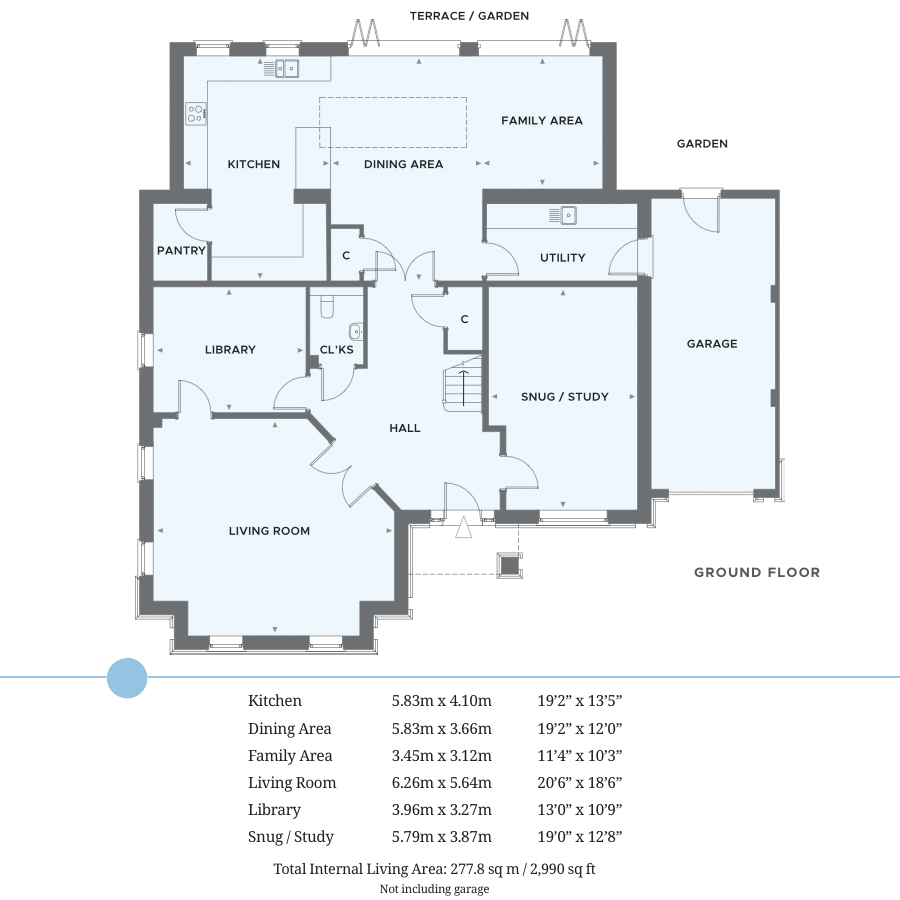 A stylish, versatile four-bedroom home with a superb open-plan kitchen/dining/family room plus utility and separate pantry. Downstairs living space includes both snug/study and separate library. Bedroom 1 benefits from dressing area and 4 piece en-suite. Bedroom 2 also includes en-suite shower room.